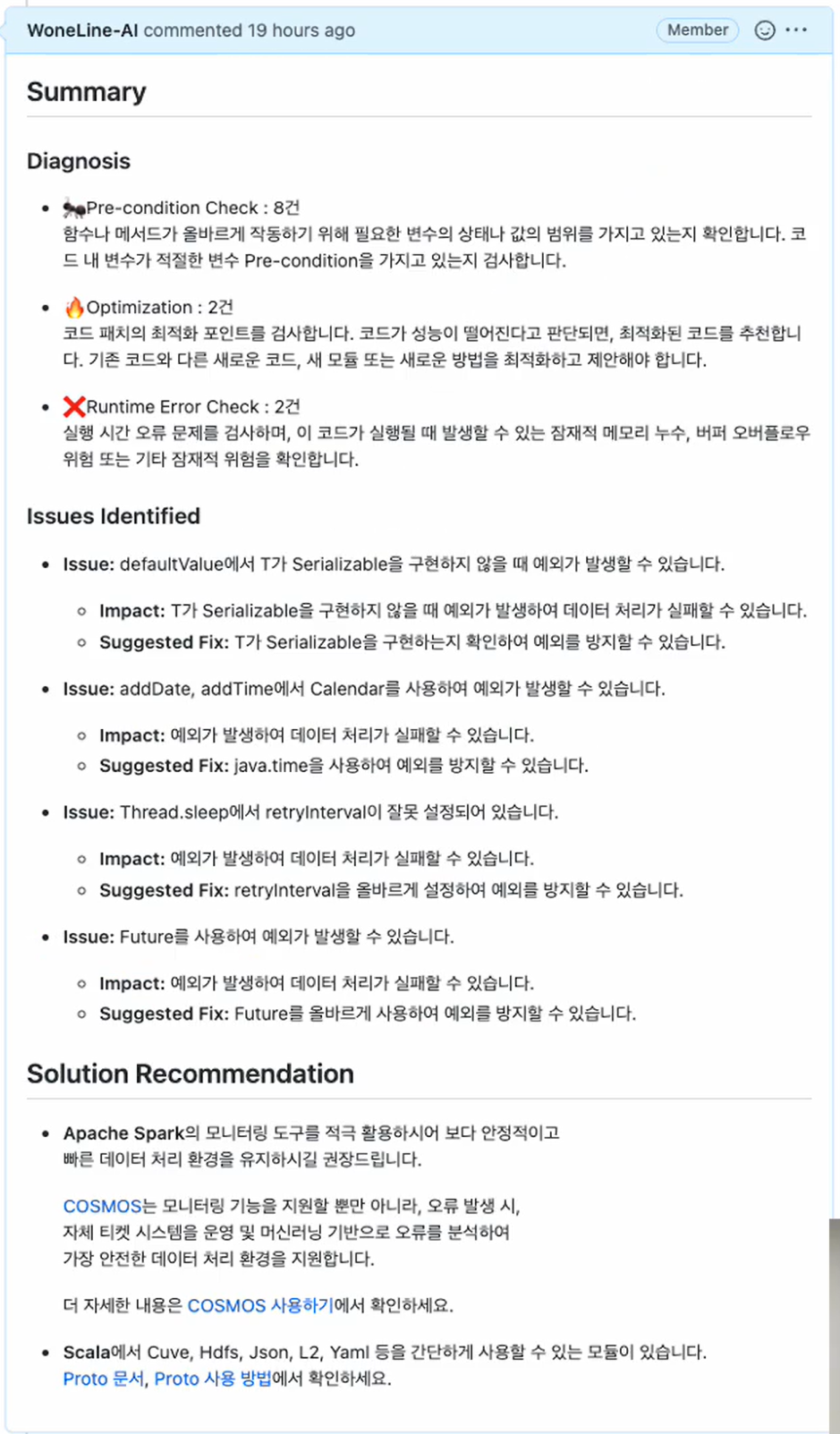 - Optimization: 코드 패치의 최적화 포인트를 검사. 코드가 성능이 떨어진다고 판단되면, 최적화된 코드 추천