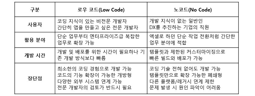 이에 따라 많은 애플리케이션의 수요가 발생하고 개발자의 수는 한정되어 있는 상황에서 기업들은 전문적인 개발 기술이 없더라도 직원들이 IT 역량을 갖추고, 디지털 전환을 위한 앱을 만들어야 하는데, 이에 대한 해결책이 바로 로우 코드 플랫폼과 노 코드 플랫폼인 것이다. 아래 표를 통해 두 플랫폼의 차이를 한 눈에 살펴보자.
