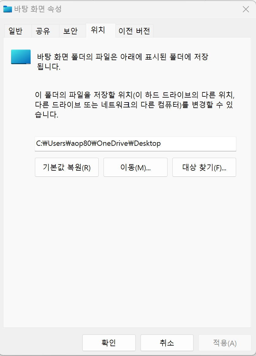 이제 바탕화면을 우클릭 하여 속성에 들어가서 위치 탭에 가면 바탕화면 이름을 변경할 수 있다.